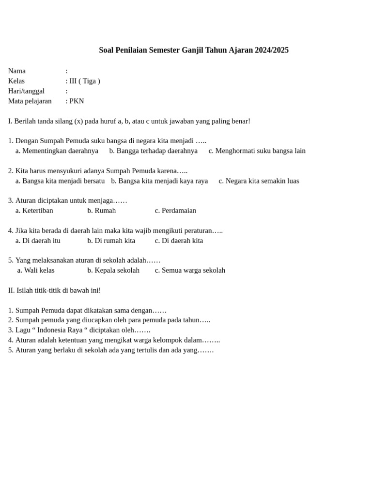 - "Contoh soal isian PKN kelas 3 MI semester 2"